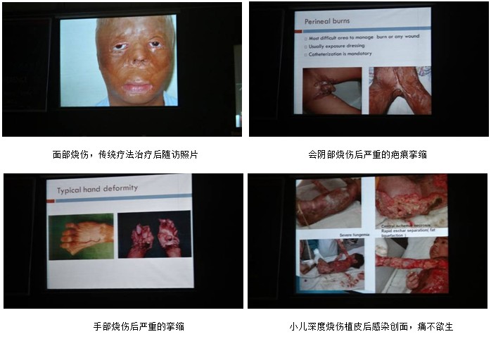 1月25日上午8點30分,會議正式開幕。第一天,印度燒傷學會安排了全天的印度國內(nèi)繼續(xù)教育(CME)項目培訓,上午是口頭演講,下午是視頻手術(shù)演示,18位來自印度各大燒傷中心的主任或者學術(shù)帶頭人就燒傷中使用傳統(tǒng)外科技術(shù)方法在創(chuàng)面及系統(tǒng)治療中進行了介紹。面對印度燒傷界專家在講臺上展示他們“成功”的案例時,我們心中卻百感交集:本不富裕的印度人民和政府卻要為傳統(tǒng)外科技術(shù)治療燒傷過程中各種手術(shù)及手術(shù)后遺癥治療時高昂的費用買單,同時燒傷病人還不得不承受創(chuàng)面恢復及身體康復過程中的痛苦;面對醫(yī)療資源的匱乏,甚至在燒傷止疼上,連最起碼地為病人減少疼痛的概念,還需要培訓專家反復呼吁參會印度醫(yī)生引起注意;一張張面目全非的臉,一幅幅嚴重攣縮瘢痕的照片,一幀幀血肉模糊的影像讓我們更加堅信高性價比的再生醫(yī)療技術(shù)非常適合印度國情,再生醫(yī)療技術(shù)在印度全面地發(fā)展指日可待。