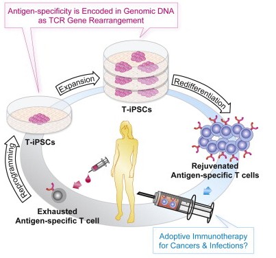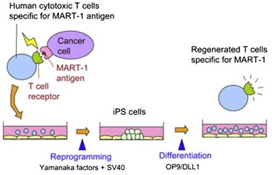 研究團隊使用的技術(shù)引用了已知的因子(山中申彌使用的因子)將成熟的免疫T細胞轉(zhuǎn)化為iPSCs。然后擴增這些iPSCs并使他們重新分化為T細胞。新生成的T細胞被還原(rejuvenate)后生長潛能提高、壽命延長,且仍然具有最初的識別癌癥和艾滋病感染靶細胞的能力。這意味著用iPSCs技術(shù)調(diào)控T細胞可能幫助將來建立更有效的免疫療法。