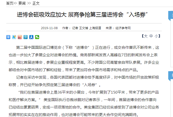 經濟參考:進博會磁吸效應加大 展商爭搶第三屆進博會“入場券”