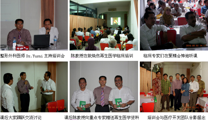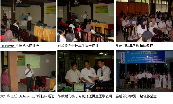 同時(shí),經(jīng)過精心策劃和安排,2010年8月1日,剛剛結(jié)束馬來西亞醫(yī)療開發(fā)與維護(hù)工作的中國燒傷創(chuàng)瘍科技中心臨床部主任、北京榮祥再生醫(yī)學(xué)研究所副所長、北京中西醫(yī)結(jié)合學(xué)會燒傷專業(yè)委員會副主任委員陳永翀教授顧不上休息,便馬不停蹄地趕往印度尼西亞(印尼),在Combiphar 負(fù)責(zé)醫(yī)療開發(fā)的Mr. Kirastha 的組織、安排和全程陪同下,展開了印尼2010年的第二輪醫(yī)療開發(fā)工作。在這次的醫(yī)療開發(fā)工作中,能夠很好地和各級醫(yī)師學(xué)會或醫(yī)院緊密合作,有效地提高了培訓(xùn)班的組織能力、影響力、學(xué)術(shù)水平等,由于有繼教學(xué)分而且培訓(xùn)內(nèi)容新穎、實(shí)用,而很受臨床醫(yī)護(hù)人員的歡迎,為醫(yī)療開發(fā)摸索出了一條很好的路子。在這次的醫(yī)療開發(fā)過程中,通過這種模式成功參加了印尼全國的燒傷整形外科大會,舉辦了省級培訓(xùn)班2期,市級培訓(xùn)班3期,院內(nèi)培訓(xùn)班2期,重點(diǎn)專家學(xué)術(shù)交流5次,培訓(xùn)了燒傷、整形、普通外科、皮膚科、骨科、婦產(chǎn)科醫(yī)師和護(hù)士690多名,培訓(xùn)市場醫(yī)療開發(fā)人員19名,成功開發(fā)了不少于5家大型政府教學(xué)醫(yī)院,會診、指導(dǎo)1例大面積特重度燒傷和另外5例創(chuàng)瘍患者的治療。由于開發(fā)的路子對,達(dá)到了高效率的開發(fā)效果。下面以簡短的圖文方式與大家分享成功的經(jīng)驗(yàn)。