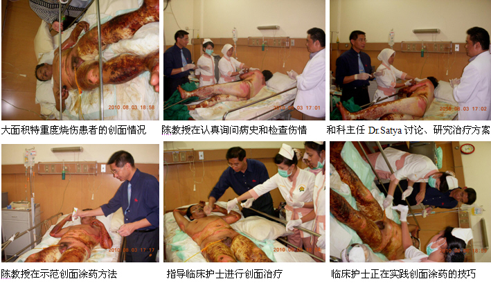 3、8月3日下午,陳教授一行完成了在Fatmawati hospital的培訓(xùn)任務(wù)后,馬上又應(yīng)邀到雅加達(dá)市的Harapan Bunda hospital會診、指導(dǎo)一例大面積特重度燒傷的患者。該患者是一名男性,47歲。因被火焰燒傷全身而入院。臨床診斷:1、大面積特重度燒傷(75%TBSA深I(lǐng)I度---深I(lǐng)II度);2、中度吸入性損傷。由于患者燒傷面積大、深度深,且是該院收治的第一例特重度燒傷患者,為了更好地使用燒傷再生醫(yī)學(xué)技術(shù)治療該患者,醫(yī)院特地邀請陳教授對該患者進(jìn)行會診和指導(dǎo)。陳教授到了病房后首先聽取了病情匯報(bào),然后認(rèn)真詢問了病史、查閱了病歷資料、護(hù)理記錄和進(jìn)行了細(xì)致的體格檢查,并結(jié)合該病例的具體傷情和情況,提出了一整套具體的全身系統(tǒng)治療和創(chuàng)面治療方案。討論和制定了治療方案后,陳教授親自為大家示范了深度燒傷痂皮的耕耘減張技術(shù)和燒傷濕潤暴露療法的創(chuàng)面治療方法。