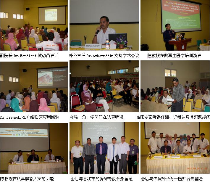 4、8月5日上午10時(shí),由印尼醫(yī)師學(xué)會主辦、Zainul Abidin Hospital承辦的Banda Aceh省級燒傷再生醫(yī)學(xué)臨床培訓(xùn)班(省級繼續(xù)教育項(xiàng)目,學(xué)分12分)在Zainul Abidin Hospital學(xué)術(shù)報(bào)告廳里成功舉辦。Zainul Abidin Hospital是當(dāng)?shù)刈畲蟮慕虒W(xué)醫(yī)院,500病床,醫(yī)院正在計(jì)劃利用再生醫(yī)學(xué)技術(shù)的優(yōu)勢籌建燒傷中心。來自全省3個主要城市的5家政府醫(yī)院和其它20多家私營醫(yī)院的120多名臨床醫(yī)師、護(hù)士參加了這次培訓(xùn)會。該院副院長Dr.Mardiani到會,并做動員講話。學(xué)術(shù)交流由醫(yī)院的大外科主任Dr. Azharuddin主持,陳教授應(yīng)邀作了“燒傷再生醫(yī)學(xué)與療法在燒傷、創(chuàng)瘍疾病治療的臨床規(guī)范應(yīng)用”的培訓(xùn)演講。另外,該院的整形、燒傷外科醫(yī)師Dr.Bismedi結(jié)合自己近期應(yīng)用再生醫(yī)學(xué)技術(shù)治療的2例燒傷患者向大家介紹了臨床應(yīng)用的經(jīng)驗(yàn)和體會。培訓(xùn)班的學(xué)術(shù)氛圍濃厚,大家學(xué)習(xí)、交流再生醫(yī)學(xué)技術(shù)的熱情高漲,效果理想。