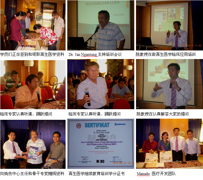 6、8月12日上午9時(shí),由醫(yī)師學(xué)會主辦的Manado省級燒傷再生醫(yī)學(xué)臨床培訓(xùn)班(省級繼續(xù)教育項(xiàng)目,學(xué)分8分)在Aston Hotel酒店的會議室里舉辦,來自全省主要的4個城市的8家政府醫(yī)院和其它20多家私營醫(yī)院的89名臨床醫(yī)師、護(hù)士參加了這次培訓(xùn)會。培訓(xùn)會由Manado 總醫(yī)院燒傷整形外科主任Dr. Jan Ngantung主持,陳教授應(yīng)邀作了“燒傷再生醫(yī)學(xué)與療法在燒傷、創(chuàng)瘍疾病治療的臨床規(guī)范應(yīng)用”的培訓(xùn)演講,很受大家的歡迎,達(dá)到了較理想的培訓(xùn)效果。