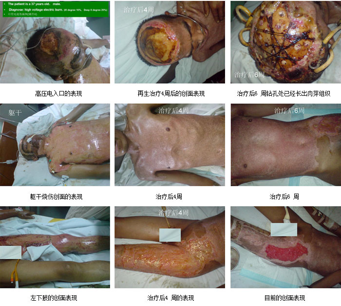 患者入院后,外科主任和醫(yī)師們根據(jù)患者的病情和再生技術(shù)的優(yōu)勢(shì),經(jīng)過(guò)討論后,決定選擇燒傷皮膚原位再生技術(shù)進(jìn)行治療。在搶救和治療期間,主管醫(yī)師Dr.Roys和北京中國(guó)燒傷創(chuàng)瘍科技中心的臨床專家陳永翀教授積極聯(lián)系,陳教授則通過(guò)E-mail對(duì)印尼方面的醫(yī)師進(jìn)行了技術(shù)指導(dǎo)。由于萬(wàn)隆市的R.S Immanuel Hospital醫(yī)院的醫(yī)師們規(guī)范采用了再生醫(yī)學(xué)技術(shù)對(duì)患者進(jìn)行全身系統(tǒng)治療和創(chuàng)面的耕耘處理,使患者安全度過(guò)了休克期,創(chuàng)面得到了很好的保護(hù)和挽救。目前,深I(lǐng)I度和淺III度創(chuàng)面均已愈合,深I(lǐng)II度的創(chuàng)面也呈現(xiàn)出良好的生長(zhǎng)情況,顱骨裸露的創(chuàng)面已經(jīng)進(jìn)行了第2次鉆孔并埋置了擴(kuò)張器,鉆孔的地方已經(jīng)生長(zhǎng)出新的肉芽組織,預(yù)計(jì)大約1個(gè)月可以完全封閉創(chuàng)面。以下是部分病例資料相片。