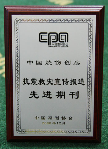 中國期刊協(xié)會為了表彰先進,于今年8月在全國期刊界開展了評選抗震救災宣傳報道先進期刊及先進個人的活動,在經(jīng)過中宣部出版局、民政部、新聞出版總署有關(guān)部門的領(lǐng)導和業(yè)界專家組成的評審委員會進行認真評審后,決定授予106種期刊“全國抗震救災宣傳報道先進期刊”的榮譽稱號,《中國燒傷創(chuàng)瘍雜志》在全國九千多種期刊中涌現(xiàn)了出來,獲此殊榮。