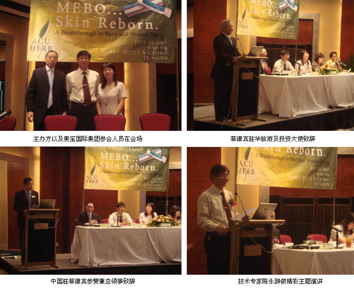 2007年7月26日晚19點(diǎn)半,美寶產(chǎn)品發(fā)布會于菲律賓馬尼拉最著名的Hyatt Hotel隆重召開。此次發(fā)布會是美寶國際集團(tuán)在菲律賓的合作伙伴-菲律賓菲亞華公司向菲律賓人介紹美寶濕潤燒傷膏的一個(gè)良好契機(jī)。參加此次產(chǎn)品發(fā)布會的有政界代表,如菲律賓駐華旅游及投資大使、中國駐菲律賓總領(lǐng)事、菲律賓眾議員;也有商界代表,如菲律賓最大的已具有62年?duì)I銷歷史的Mercury Drugs藥店的銷售經(jīng)理;還有來自菲律賓的著名醫(yī)院,例如菲律賓最大的菲律賓總醫(yī)院、馬尼拉市立醫(yī)院以及Manila Doctors Hospital 等9個(gè)醫(yī)院的70多個(gè)醫(yī)生代表;同時(shí)還有包括新華社、光明日報(bào)、The Philippine Star、Philippine Daily Inquirer 等數(shù)家新聞媒體的代表。美寶國際集團(tuán)派出技術(shù)專家陳永羽中以及境外經(jīng)營總部技術(shù)主管李曉輝參會。首先,菲亞華公司總裁鄭啟明先生致開場辭,感謝大家參加這一第一個(gè)作為處方藥在菲律賓成功注冊的來自中國的藥品的發(fā)布會。菲律賓駐華旅游及投資大使做了熱誠洋溢的演講,高度贊揚(yáng)了鄭先生在引進(jìn)中國的先進(jìn)藥品方面所做的巨大貢獻(xiàn),并提出,在菲律賓官方對中國食品藥品很不感冒的情況下,該產(chǎn)品發(fā)布會的順利舉行本身就是一個(gè)很大的成功,并祝賀美寶濕潤燒傷膏成為第一個(gè)來自中國并在菲律賓成功注冊的處方藥。中國駐菲律賓參贊及總領(lǐng)事對于中國藥品所取得的成就感到驕傲,并聲明將更加支持中國醫(yī)藥在菲律賓的發(fā)展。技術(shù)專家陳永羽中做了關(guān)于燒傷皮膚再生醫(yī)學(xué)在燒傷、瘡瘍領(lǐng)域的應(yīng)用效果以及其他器官再生的實(shí)驗(yàn)室研究成果的精彩演講。與會人員全部聚精會神聽講。大量醫(yī)生在會后找到主辦方以及陳主任,要求親自示范這一先進(jìn)技術(shù)。境外經(jīng)營總部技術(shù)主管李曉輝對于美寶國際集團(tuán)以及再生醫(yī)學(xué)這一先進(jìn)技術(shù)的一個(gè)總結(jié)性的報(bào)告贏得了大家的一致認(rèn)同:再生醫(yī)學(xué)將造福菲律賓廣大民眾!