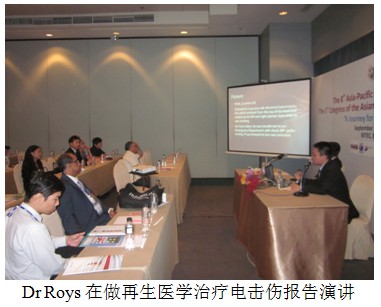 第三位演講者是來(lái)自印尼的Dr. Roys A. Pangajoman, 他也是實(shí)踐美寶再生療法的資深醫(yī)生了,曾經(jīng)發(fā)表了一篇應(yīng)用美寶治療電擊傷的臨床論文,這次他的演講內(nèi)容便是針對(duì)一例顱骨嚴(yán)重電擊傷的成功案例。他將運(yùn)用再生醫(yī)學(xué)療法對(duì)此例電擊傷患者治療的詳盡過(guò)程跟蹤圖片資料,病人創(chuàng)面的處理演示及愈合情況,生動(dòng)、客觀地展示給了與會(huì)的聽(tīng)眾,雖然只是一個(gè)病例的展示,但是基于他的病例的嚴(yán)重程度、典型性,以及再生療法在整個(gè)治療中顯示出的優(yōu)勢(shì),都使在場(chǎng)的聽(tīng)眾為止贊嘆并紛紛提問(wèn)。