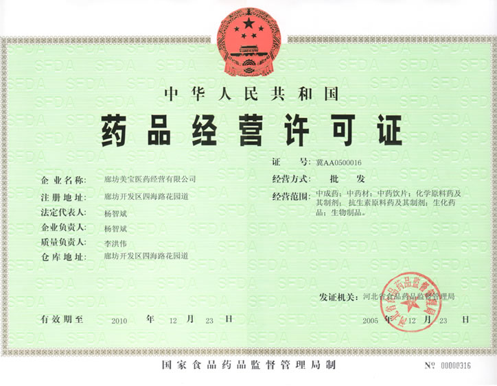 廊坊美寶醫(yī)藥經(jīng)營有限公司在基地全體員工的共同努力下,在集團董事局的關(guān)懷和指導(dǎo)下,于2005年12月13日順利通過了藥品監(jiān)督管理局的藥品經(jīng)營許可證的驗收檢查。并于2005年12月31日取得藥品經(jīng)營許可證。這標(biāo)志著廊坊美寶基地按照美寶國際集國的總體規(guī)劃,向GSP經(jīng)營方向邁出了成功的第一步。