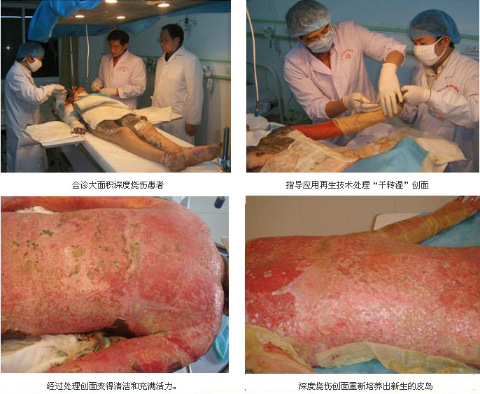 擴(kuò)大燒傷再生醫(yī)學(xué)的學(xué)術(shù)影響。2007年3月19日,在商洛市中醫(yī)醫(yī)院舉辦了“再生醫(yī)學(xué)與燒傷皮膚再生技術(shù)”培訓(xùn)班,通過(guò)學(xué)習(xí)大家對(duì)燒傷皮膚再生技術(shù)在大面積深度燒傷的救治上有了更深的認(rèn)識(shí)和了解。培訓(xùn)班結(jié)束后,醫(yī)院邀請(qǐng)前來(lái)講課的陳永翀副所長(zhǎng)到燒傷科進(jìn)行查房,重點(diǎn)討論和制定了采用燒傷皮膚再生技術(shù)治療傳統(tǒng)干燥結(jié)痂的大面積燒傷患者的治療方案。該患者是前段時(shí)間從西安軍醫(yī)大某附屬醫(yī)院轉(zhuǎn)回來(lái)的,轉(zhuǎn)入診斷:1、大面積特重度燒傷干燥保痂治療后(TBSA=85%,III度65%);2、吸入性損傷氣管切開(kāi)術(shù)后;3、低蛋白血癥。經(jīng)過(guò)討論,大家一致同意選擇和改用治療痛苦小、能促進(jìn)創(chuàng)面愈合、費(fèi)用低、能減少瘢痕和殘疾的燒傷皮膚再生技術(shù)給患者治療。