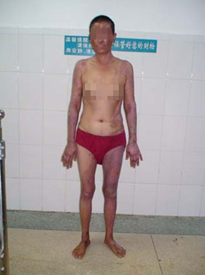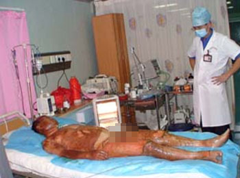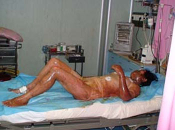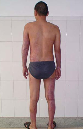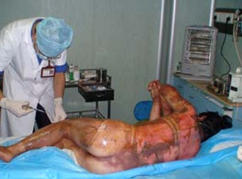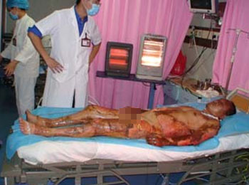 2006年9月11日晚7點,廣州花都中醫(yī)院ICU病房急診收入兩例成人大面積燒傷患者,該兩例患者為該區(qū)某造紙廠工人,在入院前1小時,工作中因蒸汽管道泄漏致蒸汽燒傷。病例一、患者江某、男36歲,入院診斷:全身蒸汽燒傷總面積70%(淺二度15%、深二度45%、淺三度10%);病例二、患者江某、女、42歲,入院診斷:全身蒸汽燒傷總面積72%(淺二度7%、深二度50%、淺三度15%)。患者入院后,該院立即成立了以主管院長劉樹華和大外科主任張向東為首的搶救領(lǐng)導(dǎo)小組,并邀請北京美寶燒傷創(chuàng)瘍研究所王洪生研究員進行全程臨床指導(dǎo),對該兩例患者創(chuàng)面處理全程采用燒傷皮膚原位再生醫(yī)療技術(shù),結(jié)合全身抗休克、抗感染、營養(yǎng)支持、臟器功能保護等綜合治療,經(jīng)過一個月的治療,兩例患者順利渡過休克關(guān)、感染關(guān),淺、深創(chuàng)面均實現(xiàn)了表皮化愈合,目前,該兩例患者燒傷已痊愈,正在該院接受康復(fù)期治療。