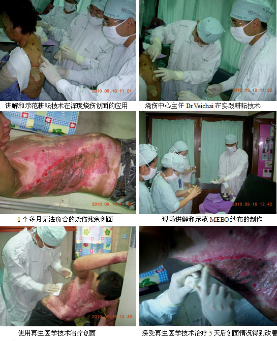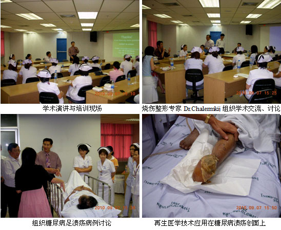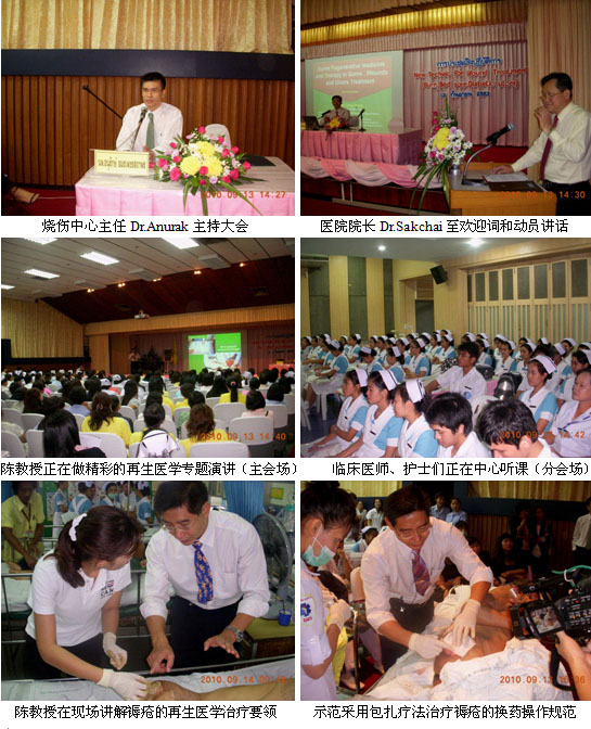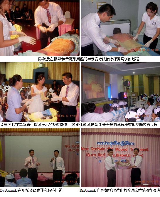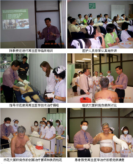 此次為了進(jìn)一步鞏固成果,加快再生醫(yī)學(xué)技術(shù)在泰國的臨床應(yīng)用,2010年9月5日至9月17日,經(jīng)過泰國市場區(qū)域經(jīng)理吳云及當(dāng)?shù)卮砩?、?jīng)銷商的精心的組織和策劃,中國燒傷創(chuàng)瘍科技中心臨床部主任、北京榮祥再生醫(yī)學(xué)研究所副所長、北京中西醫(yī)結(jié)合學(xué)會(huì)燒傷專業(yè)委員會(huì)副主任委員、中國燒傷創(chuàng)瘍雜志社副社長陳永翀教授應(yīng)邀到泰國10多家大型政府醫(yī)院及私人醫(yī)院進(jìn)行學(xué)術(shù)演講、技術(shù)培訓(xùn)和臨床指導(dǎo), 培訓(xùn)了泰國的醫(yī)護(hù)人員總計(jì)478人,會(huì)診指導(dǎo)和操作示范深度燒傷、慢性潰瘍、糖尿病潰瘍等病例共計(jì)17例,有效地鞏固并擴(kuò)大了燒傷再生醫(yī)學(xué)在泰國的學(xué)術(shù)地位,醫(yī)療開發(fā)工作取得了前所未有的突破,老基地掀起了學(xué)習(xí)應(yīng)用再生醫(yī)學(xué)技術(shù)的熱潮、呈現(xiàn)出勃勃生機(jī)。