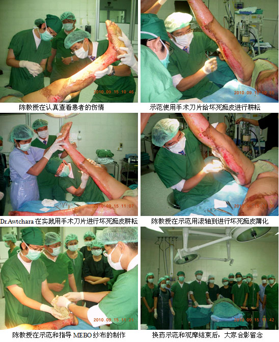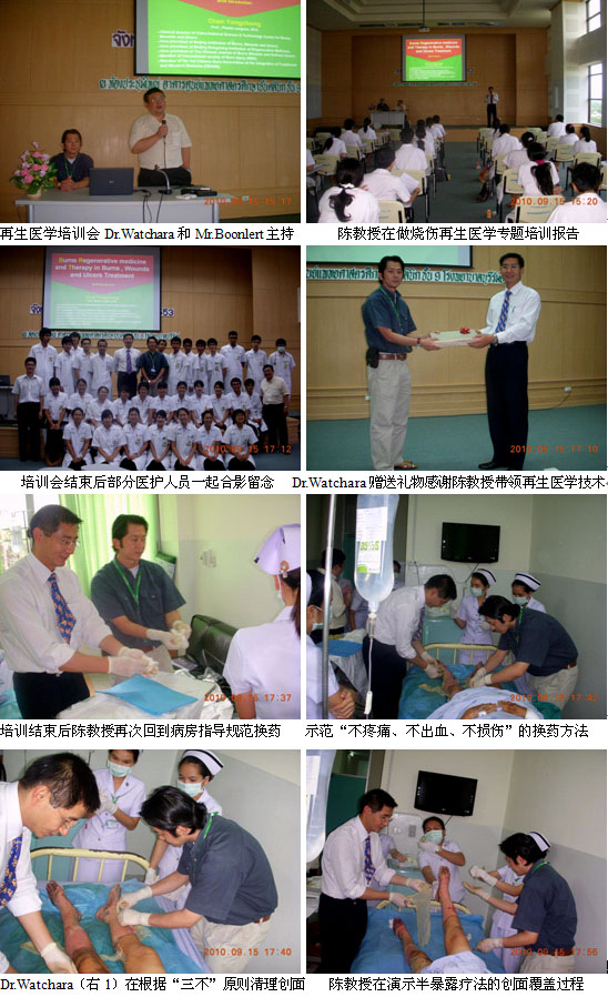 1、二次培訓(xùn)與臨床指導(dǎo)是對老醫(yī)院的有效維護(hù)與提高。9月6日、11日和16日,陳教授先后3次應(yīng)邀到曼谷市Klang Hospital 進(jìn)行培訓(xùn)和臨床指導(dǎo),30多名燒傷、整形和外科醫(yī)師、護(hù)士參加了培訓(xùn),多名燒傷創(chuàng)瘍患者在陳教授的指導(dǎo)下接受了再生醫(yī)學(xué)的治療,并取得了較好的臨床效果。