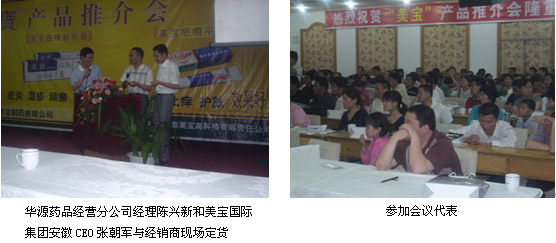 2006年5月27日下午2時30分,承接本次會議的太和鏡湖賓館的大廳內(nèi)擠滿了前來簽到報(bào)名的與會代表。參加本次培訓(xùn)推介會的有來自安徽華源醫(yī)藥股份有限公司和美寶國際集團(tuán)的各級領(lǐng)導(dǎo)、安徽華源醫(yī)藥股份有限公司的二級分銷商和部分第三終端客戶,近200人參加了本次推介會。3時推介會正式開始,會議由安徽華源醫(yī)藥股份有限公司藥品經(jīng)營部經(jīng)理王沖主持,首先安徽華源醫(yī)藥股份有限公司黨委副書記、紀(jì)檢書記、行政總監(jiān)、副總經(jīng)理總經(jīng)理張文濤致歡迎詞并預(yù)祝本次會議圓滿成功,隨后其藥品經(jīng)營分公司經(jīng)理陳興新向與會代表介紹了公司近幾年來的發(fā)展以及北京華源項(xiàng)目進(jìn)展情況,北京美寶燒傷研究所方進(jìn)勇主任用幻燈向大家介紹了美寶國際集團(tuán)在生命科學(xué)領(lǐng)域的最新進(jìn)展以及美寶高科技系列產(chǎn)品,美寶國際集團(tuán)常務(wù)董事、原燒傷創(chuàng)瘍再生醫(yī)學(xué)經(jīng)濟(jì)板塊總裁陳寶琪生動幽默的發(fā)言將會議推向高潮,他介紹了他本人及美寶多年來同太和的感情、美寶在再生醫(yī)學(xué)的霸主地位、產(chǎn)品在多學(xué)科、多領(lǐng)域的應(yīng)用等,最后陳總用“信任、效益、價(jià)值、發(fā)展”八個字總結(jié)了美寶國際集團(tuán)和安徽華源醫(yī)藥股份有限公司的合作。