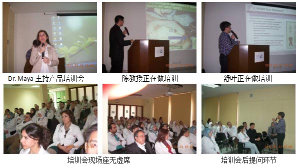 2. 2月23日早上10點(diǎn)半,美寶推廣團(tuán)隊(duì)再次來(lái)到賽達(dá)市,為當(dāng)?shù)匾患宜搅⒋髮W(xué)附屬醫(yī)院Hammoud Hospital的醫(yī)務(wù)人員進(jìn)行專(zhuān)門(mén)的疤痕軟膏培訓(xùn)。培訓(xùn)會(huì)由Dr. Maya主持,Dr. Maya是藥學(xué)的博士,現(xiàn)在負(fù)責(zé)美寶所有產(chǎn)品在黎巴嫩的經(jīng)營(yíng)工作。醫(yī)院共計(jì)有60余名醫(yī)生、藥師、護(hù)士參加此次培訓(xùn)會(huì)。當(dāng)醫(yī)生們看到再生醫(yī)療技術(shù)及其配套產(chǎn)品在抗疤領(lǐng)域所取得驕人成績(jī)時(shí),詳細(xì)地詢問(wèn)我們的產(chǎn)品和現(xiàn)在主流的產(chǎn)品硅膠貼有何不同等相關(guān)問(wèn)題。負(fù)責(zé)產(chǎn)品推廣的舒葉解釋說(shuō),硅膠貼和疤痕平在抗疤的原理上有一小部分是相似的,那就是兩種產(chǎn)品都能保持創(chuàng)面的濕潤(rùn)。但是硅膠貼使用合成的材料來(lái)保持創(chuàng)面濕潤(rùn),而疤痕平卻是用獨(dú)特的由天然成分蜂蠟和麻油組成的框架劑型來(lái)保持接近于正常皮膚水分丟失來(lái)保持創(chuàng)面濕潤(rùn),這是硅膠貼產(chǎn)品所不能比擬的;除此,疤痕軟膏中各種物質(zhì)能提供給細(xì)胞各種必需的營(yíng)養(yǎng)成分,調(diào)節(jié)膠原蛋白正常生長(zhǎng),以此來(lái)達(dá)到預(yù)防和治療疤痕的效果。