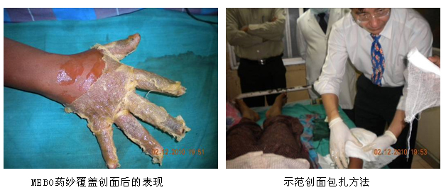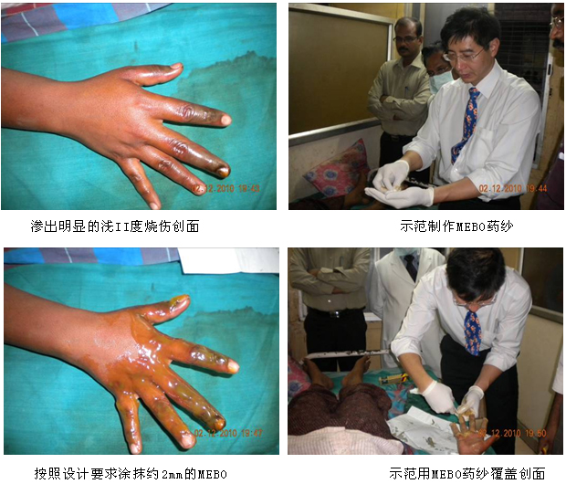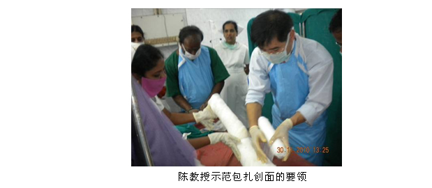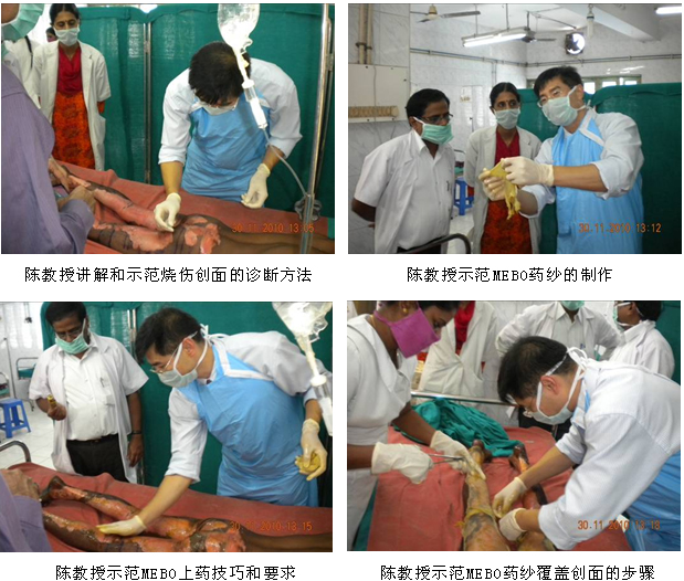 2、11月30日~12月1日,陳教授一行按計(jì)劃在KMC燒傷中心進(jìn)行臨床試驗(yàn)的培訓(xùn),對(duì)創(chuàng)面處理技術(shù)進(jìn)行了示范和指導(dǎo)。按照研究設(shè)計(jì),美寶濕潤(rùn)燒傷膏印度III期臨床試驗(yàn)是多中心隨機(jī)對(duì)照的試驗(yàn),因此陳教授先在試驗(yàn)組示范了燒傷再生醫(yī)學(xué)與療法治療燒傷病例的標(biāo)準(zhǔn)操作程序(燒傷再生醫(yī)學(xué)之包扎療法),然后又給對(duì)照組示范了傳統(tǒng)方法治療燒傷創(chuàng)面的規(guī)范操作技術(shù)。經(jīng)過(guò)這2天的簡(jiǎn)短的培訓(xùn),使參與研究的醫(yī)護(hù)人員更多地了解了整個(gè)臨床試驗(yàn)的設(shè)計(jì)、實(shí)施步驟、創(chuàng)面處理要求、病例登記表的填寫等,為高質(zhì)量和保障安全地展開臨床試驗(yàn)打下了一定的基礎(chǔ)。