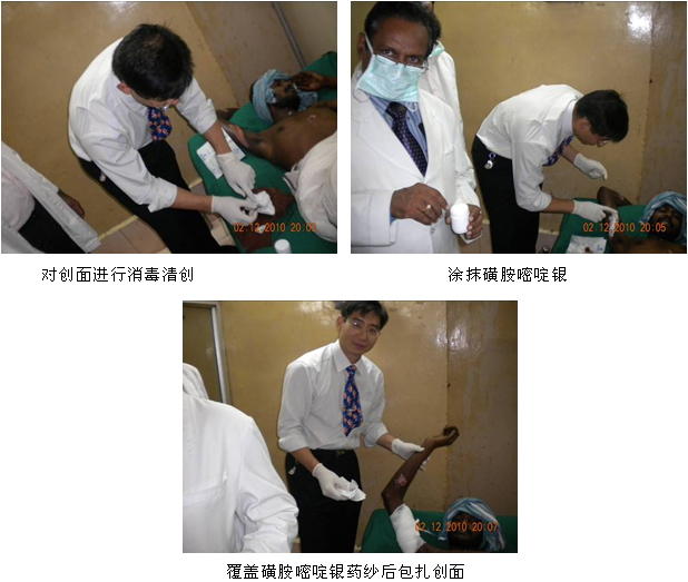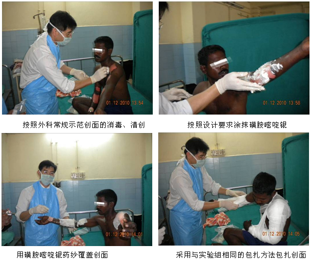B、對(duì)照組(磺胺嘧啶銀組)病例創(chuàng)面的處理操作示范: