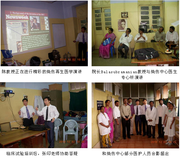 隨著徐榮祥教授發(fā)明的燒傷再生醫(yī)學(xué)在國(guó)際上的影響力和知名度的擴(kuò)大,越來(lái)越多的國(guó)家希望早日引進(jìn)再生醫(yī)學(xué)技術(shù)和配套產(chǎn)品-----美寶濕潤(rùn)燒傷膏(MEBO),印度便是其中之一。為了盡快引進(jìn)MEBO,經(jīng)印度藥監(jiān)局(DCGI)的批準(zhǔn),MEBO在印度的III期臨床試驗(yàn)于2010年7月正式啟動(dòng)并在各級(jí)醫(yī)院逐步展開。為了保證臨床試驗(yàn)的安全、順利進(jìn)行和對(duì)新增加的2家大型政府醫(yī)院的燒傷中心的參研人員進(jìn)行培訓(xùn),同時(shí)也是應(yīng)印度燒傷整形外科學(xué)會(huì)主席、欽奈醫(yī)學(xué)院附屬醫(yī)院燒傷中心主任Jayaraman教授的邀請(qǐng),2010年年末,中國(guó)燒傷創(chuàng)瘍科技中心臨床部主任、北京榮祥再生醫(yī)學(xué)研究所副所長(zhǎng)陳永翀教授和技術(shù)支持專員張印來(lái)到了Chennai市醫(yī)學(xué)院附屬醫(yī)院(KMC)和Madurai市醫(yī)科大學(xué)附屬醫(yī)院,向臨床醫(yī)護(hù)人員介紹了燒傷再生醫(yī)學(xué)研究應(yīng)用新進(jìn)展,對(duì)參與臨床試驗(yàn)的人員進(jìn)行了培訓(xùn),并指導(dǎo)臨床試驗(yàn)工作等。再生醫(yī)學(xué)的先進(jìn)性、實(shí)用性、有效性和便于掌握等,很受印度臨床醫(yī)師的歡迎,目前臨床試驗(yàn)正在有序進(jìn)行,并取得了初步的成功。現(xiàn)給讀者做一個(gè)簡(jiǎn)短的介紹: