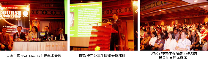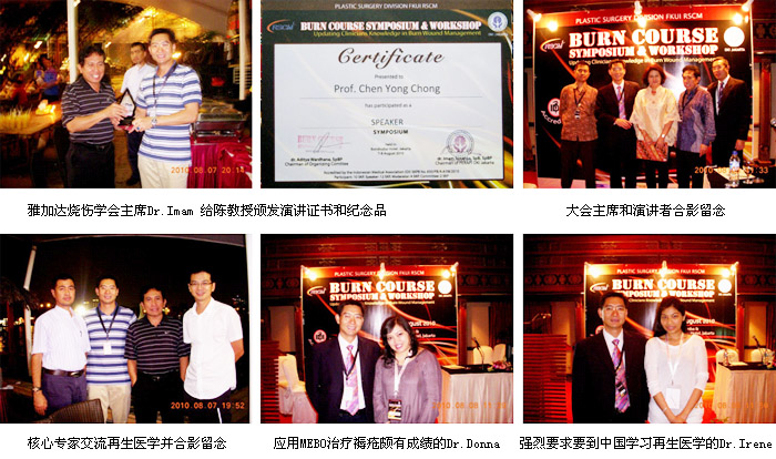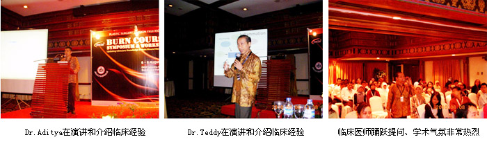 另外,在這次會議期間,除了來自中國的燒傷再生醫(yī)學(xué)專家陳教授做了燒傷再生醫(yī)學(xué)專題演講外,來自雅加達(dá)Cipto醫(yī)院燒傷整形科的Dr. Aditya Wardhana以“Topical Dressing for Burn”為題介紹了自己在燒傷治療方面的臨床經(jīng)驗和體會,特別向大家展示了他2008年到四川進(jìn)修、學(xué)習(xí)燒傷再生醫(yī)學(xué)技術(shù)的親身經(jīng)歷,以及回國后應(yīng)用燒傷再生療法成功救治的40多例燒傷患者所取得的優(yōu)異效果,很受大家的青睞;還有,來自Cipto 醫(yī)院燒傷整形科的Dr. Teddy在他的發(fā)言中也介紹了自己自2006年起,應(yīng)用燒傷再生醫(yī)學(xué)治療頭面部、雙手、上肢及大腿深度燒傷患者的臨床經(jīng)驗,向大家展示了多例成功病例,從實際應(yīng)用的角度證明了燒傷再生醫(yī)學(xué)的神奇性和優(yōu)越性。這次涉及燒傷再生醫(yī)學(xué)的、有國外專家和國內(nèi)專家配合的演講成為大家關(guān)注的焦點(diǎn)和討論的熱題,會場氣氛非常熱烈,再生醫(yī)學(xué)演講把這次大會的學(xué)術(shù)氛圍推向了高潮!
