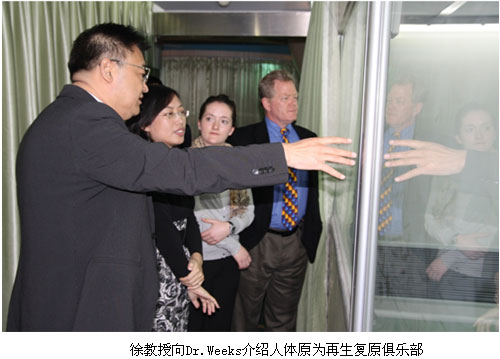 隨后,在徐教授的親自陪同下,來訪客戶參觀了人體原為再生復原俱樂部會所。徐教授向客人介紹了會所作為人體原為再生復原科學主要研究基地之一,近年來的建設成果以及未來世界范圍內的發(fā)展規(guī)劃。會所世界上獨霸的技術、獨特的風格、高檔的設施以及專業(yè)的技術實施隊伍均令Dr. Weeks一行深深折服。