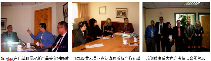 一、欲其事必先利其器。2011年3月12日,為了做好美寶創(chuàng)瘍貼的經營和啟動工作,海灣JULPHAR藥廠和阿聯(lián)酋負責美寶產品經營的人員主動放棄周六休息的時間進行產品知識培訓。中國燒傷創(chuàng)瘍科技中心臨床部的陳永翀教授給大家講解了美寶創(chuàng)瘍貼的再生醫(yī)學機理、臨床使用方法和臨床效果,Dr. Alaa Helail則向大家做了美寶創(chuàng)瘍貼新產品的介紹,期間大家還認真討論和確定了接下來的幾天在迪拜市和阿布扎比市的醫(yī)療開發(fā)與產品發(fā)布會的具體安排。通過這次培訓,使經營人員了解和掌握了美寶創(chuàng)瘍貼的再生愈合機理、效果,以及與其它同類競爭產品的區(qū)別與優(yōu)勢,大家對該產品的經營充滿了信心。