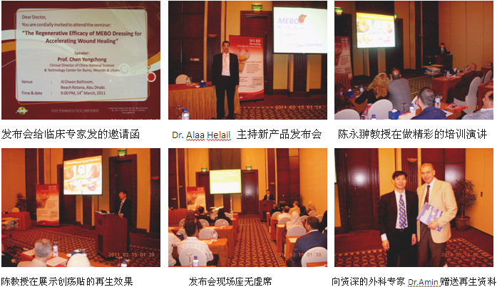 二、新產品發(fā)布與應用培訓會敲開了新市場之門。2011年3月13日和14日,美寶創(chuàng)瘍貼新產品發(fā)布與應用培訓會分別在迪拜和阿布扎比成功舉辦。來自各政府醫(yī)院、私營醫(yī)院、診所的燒傷、整形、普外、婦產、骨科、急診等數(shù)十家醫(yī)院的臨床多學科的120多名醫(yī)師、護士參加了美寶創(chuàng)瘍貼的發(fā)布培訓會(迪拜70多名,阿布扎比40多名),陳永翀教授應邀以“The Regenerative efficacy of MEBO Dressing for accelerating wound healing”(美寶創(chuàng)瘍貼再生愈合效果)為題,向參會的臨床專家們講解了創(chuàng)瘍貼的再生愈合創(chuàng)面的機理、臨床使用方法和令人嘆服的治療效果,演講很受大家的歡迎,大家也為找到一種有效而且方便使用的新產品而感到興奮和激動。這次的發(fā)布會舉辦得非常成功,反響熱烈,達到和超出了預期的效果。
