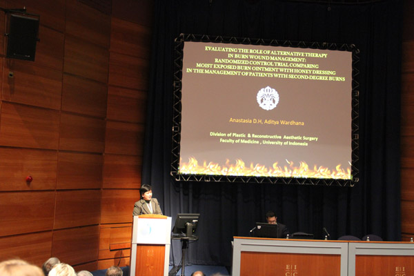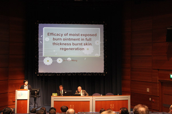 在下午的自由發(fā)言中來自印度尼西亞大學(xué)的Anastasia Dessy 醫(yī)生以再生醫(yī)療技術(shù)與蜂蜜敷料在二度燒傷創(chuàng)面的對比進行了演講。她通過兩種方法在創(chuàng)面愈合時間,愈合質(zhì)量,以及愈合后疤痕情況等等幾個方面進行了全面對比研究。并得出結(jié)論兩組對比發(fā)現(xiàn)再生醫(yī)療技術(shù)組愈合時間明顯縮短同時患者痛苦小但創(chuàng)面愈合質(zhì)量高,同時指出,在他們醫(yī)院之前的研究中已有蜂蜜輔料對傳統(tǒng)SSD的對比試驗,結(jié)果顯示蜂蜜輔料組明顯優(yōu)于SSD組,因而其結(jié)論是:MEBO是在創(chuàng)面治療中的最佳選擇。在場與會專家非常認(rèn)可并接受這種非常嚴(yán)謹(jǐn)?shù)目茖W(xué)對比試驗,對美寶的結(jié)果表示信服,同時通過上午的發(fā)言對再生醫(yī)療技術(shù)已經(jīng)有了一定的了解,因此提出更為深入的問題,如到底“美寶”是什么?(美寶的成分)以及其藥理,愈后疤痕治療評價等等問題。Anastasia醫(yī)生以她的理解一一給予解答。
