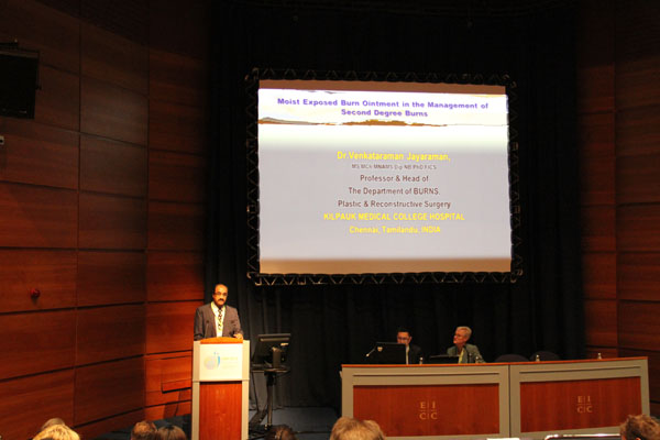 接下來,來自印度南部最大燒傷中心的主任Jayraman 醫(yī)生做了題為再生醫(yī)療技術(shù)在燒傷創(chuàng)面治療的經(jīng)驗的演講。演講過程中Jayaraman主任總結(jié)了此項技術(shù)的極大優(yōu)勢例如保持創(chuàng)面濕潤環(huán)境,抗炎抗感染以及痛苦小等等優(yōu)點。同時也展示再生醫(yī)療技術(shù)在印度臨床試驗過程收集的多個病例,通過生動鮮活的病例折服了在場所有觀眾。特別需要指出的是,Jayraman 主任對美寶的再生機理給予了詳細的解釋,從潛能再生細胞到干細胞,從再生環(huán)境到再生技術(shù),給與會專家又一全面的美寶科學(xué)的展示。在回答問題的環(huán)節(jié),Jayraman 主任與與會代表探討了燒傷愈后色素沉著的測量方法,美寶作用下干細胞再生的發(fā)生部位和過程等等,無論是提問還是回答,都相當(dāng)精彩!