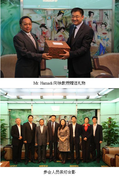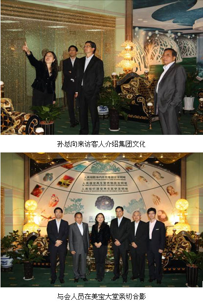 10月22日上午,美寶國際集團董事局主席徐榮祥教授在集團貴賓室親切會見Mr. Hamadi一行將本次訪問活動推向了高潮。徐教授表示美寶印尼市場一直以來都是美寶集團最為關注的市場區(qū)域之一,對雙方所達成的五年規(guī)劃、新產(chǎn)品發(fā)展計劃及新的合作模式表示祝賀,并向客人全面通報了近年來美寶在癌癥研究及再生會所等方面取得的重大進展,并提出印尼將是美寶人體再生復原俱樂部全球推廣計劃的基地之一。Mr. Hamadi首先對于徐教授的介紹表示感謝,對于美寶在癌癥研究方面取得的成就表示祝賀,同時對于徐教授提出的計劃連聲表示贊同,希望回到印尼后能夠盡快啟動這項計劃,希望自己盡快在印尼享受到人體再生復原技術帶來的養(yǎng)生效果。