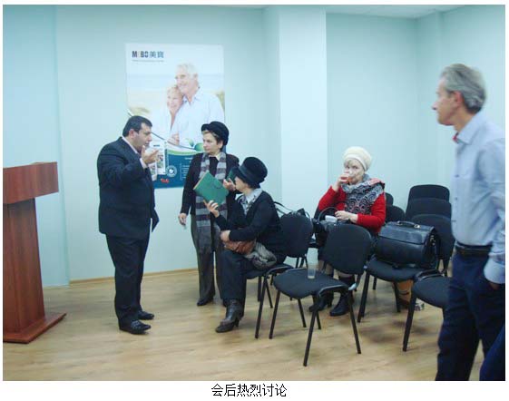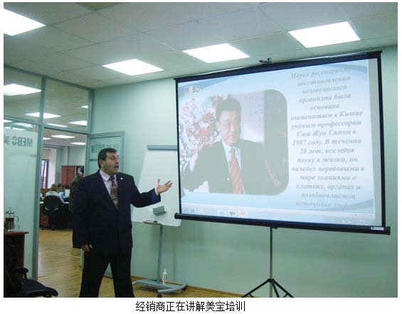 11月20日國際市場集團(tuán)總裁班子委員, 市場部總經(jīng)理劉鋼專程來莫斯科了解指導(dǎo)市場開發(fā)工作,并協(xié)調(diào)解決產(chǎn)品物流問題。借總部領(lǐng)導(dǎo)來臨的東風(fēng),分公司一周內(nèi)舉辦了兩場小型公司招商說明會,宣講美寶公司的歷史和發(fā)展,人體原位再生復(fù)原科學(xué)技術(shù)和產(chǎn)品應(yīng)用,美寶直銷業(yè)務(wù)帶來的健康財富機(jī)會,一些參會人對美寶再生科學(xué)和產(chǎn)品的神奇效果所震驚,在會后就直接報單購買加入美寶。