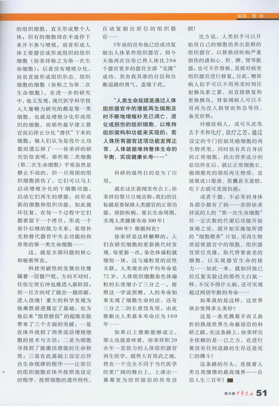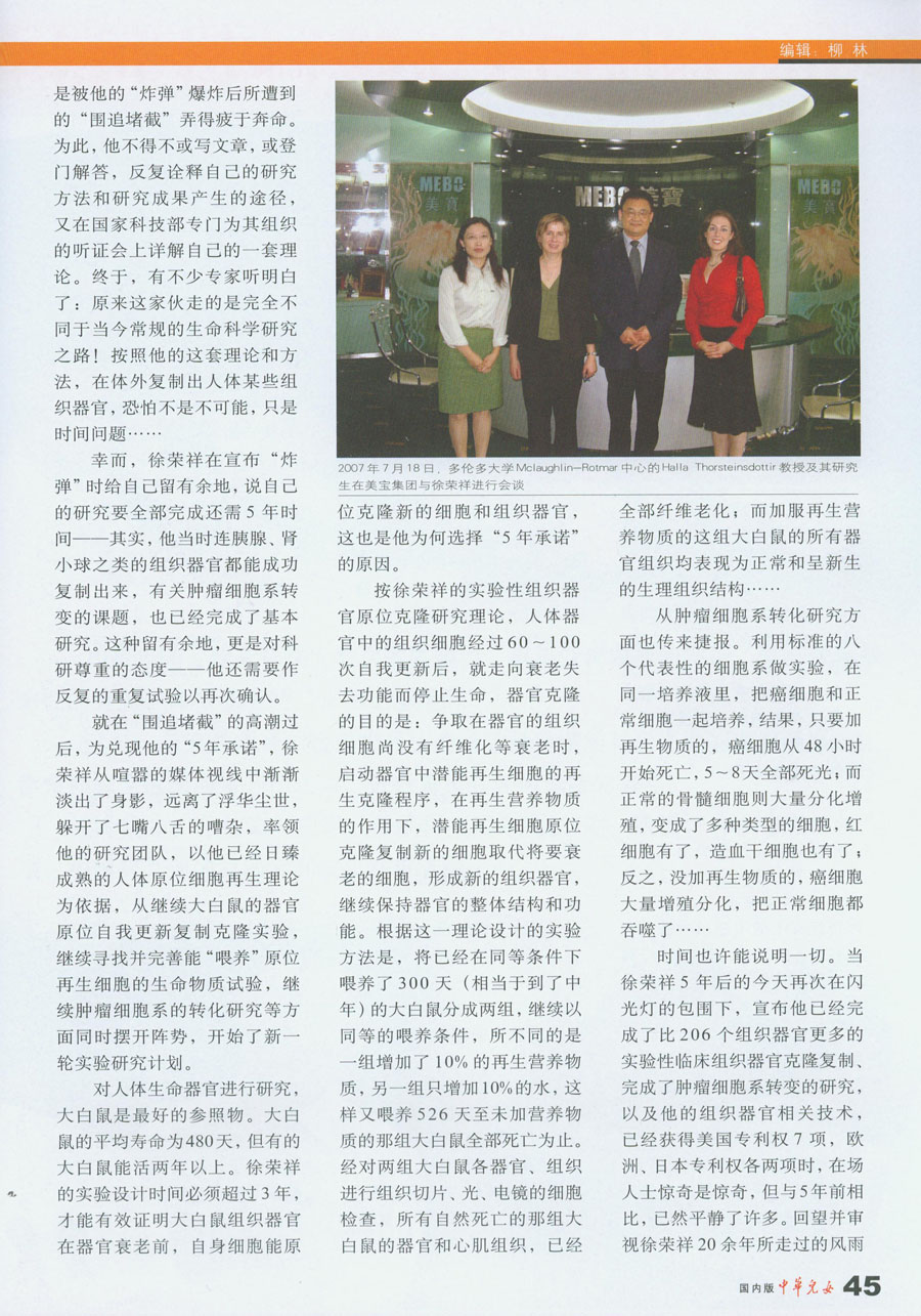 時(shí)間也許能說(shuō)明一切。當(dāng)徐榮祥5年后的今天再次在閃光燈的包圍下,宣布他已經(jīng)完成了比206個(gè)組織器官更多的實(shí)驗(yàn)性臨床組織器官克隆復(fù)制、完成了腫瘤細(xì)胞系轉(zhuǎn)變的研究,以及他的組織器官相關(guān)技術(shù),已經(jīng)獲得美國(guó)專(zhuān)利權(quán)7項(xiàng),歐洲、日本專(zhuān)利權(quán)各兩項(xiàng)時(shí),在場(chǎng)人士驚奇是驚奇,但與5年前相比,已然平靜了許多?;赝徱曅鞓s祥20余年所走過(guò)的風(fēng)雨歷程,或許他們已經(jīng)了然一一徐榮祥總是個(gè)能不斷創(chuàng)造奇跡的人。