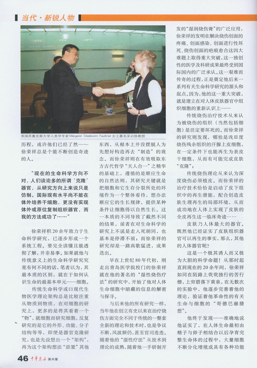 與后來(lái)他的所有研究一樣,當(dāng)年他在創(chuàng)立有史以來(lái)在治療燒傷方面完全不同于傳統(tǒng)的一整套全新的理論和技術(shù)時(shí),也是爭(zhēng)議不斷,風(fēng)波頻仍,甚至官司連連。隨著他的“濕性療法”從技術(shù)到理論的成熟,隨著他一手研制開(kāi)發(fā)的“濕潤(rùn)燒傷膏”的廣泛應(yīng)用,徐榮祥的發(fā)明在解決燒傷創(chuàng)面的疼痛、創(chuàng)面感染、創(chuàng)面進(jìn)行性壞死、燒傷創(chuàng)面的疤痕愈合這四大難題上取得重大突破,這一獨(dú)創(chuàng)性的醫(yī)學(xué)及科研成果最終受到國(guó)際國(guó)內(nèi)的廣泛承認(rèn)。這一艱難而傳奇的過(guò)程,正是奠定他后來(lái)一系列有關(guān)生命科學(xué)研究的源頭和起點(diǎn)。因?yàn)?,他的這一重大突破,就是建立在對(duì)人體皮膚器官中組織細(xì)胞的重新認(rèn)識(shí)上——