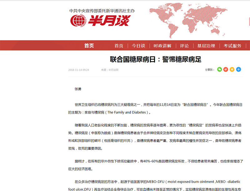 2018年11月14日,聯(lián)合國糖尿病日,中央級新聞媒體“半月談”在其網站健康欄目首頁刊發(fā)中國中西醫(yī)結合學會燒傷專委會常務委員、《中國燒傷創(chuàng)瘍》雜志編輯委員會常務委員張勇撰寫的“聯(lián)合國糖尿病日:警惕糖尿病足”一文。